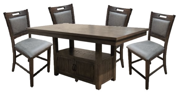Bring warmth and charm to your home with Colorado Pub. This piece features a antique light brown stain with storage in the pedestal base. Chairs and bench features faux leather upholstered with nail head accents.Read More